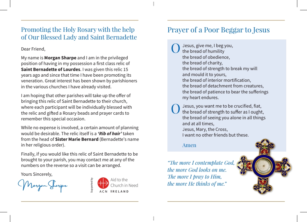 I am hoping that other parishes will take up the offer of bringing this relic of Saint Bernadette to their church, where each participant will be individually blessed with the relic and gifted a Rosary beads and prayer cards to remember this special occasion.