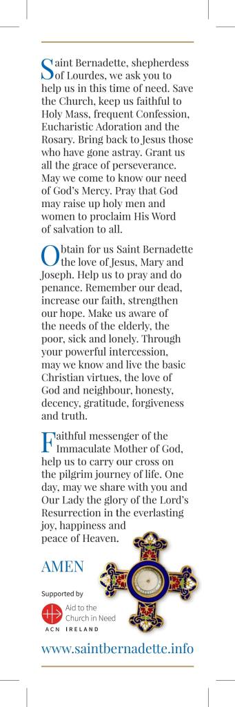 While no expense is involved, a certain amount of planning would be desirable. The relic itself is a ‘Rib of hair’ taken from the head of Sister Marie Bernard (Bernadette’s name in her religious order).